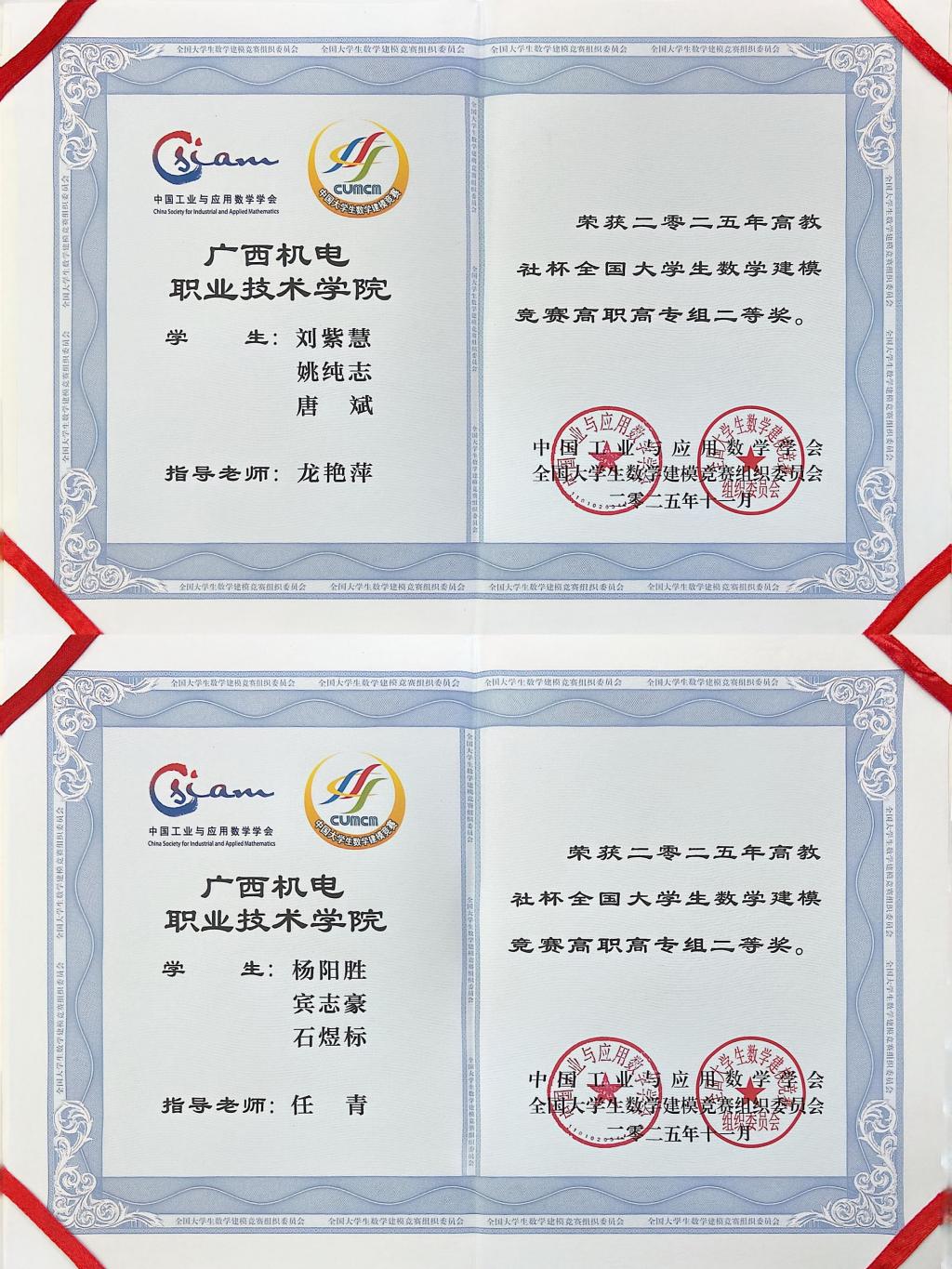 近日,2025年全国大学生数学建模竞赛获奖名单揭晓,万象城官网学子共斩获全国二等奖2项、广西赛区二等奖4项、三等奖1项,获奖等级与数量均突破万象城官网在该项赛事中的历届最好成绩。龙艳萍、任青凭借出色的指导表现,荣获广西赛区“优秀指导老师”称号。
