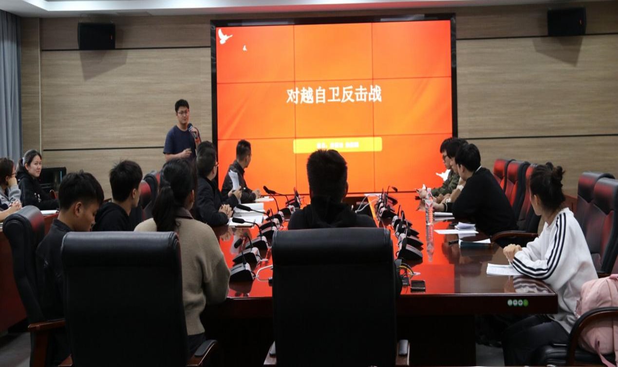 此次活动旨在使党员同志、入党积极分子们了解中国共产党的历史,加深对党的认识,把红色精神传承与发扬。本次活动是围绕《对越自卫反击战》开展,本次演讲内容由第五组成员共同准备,演讲者是焊接2201班的赖振鹏同学。