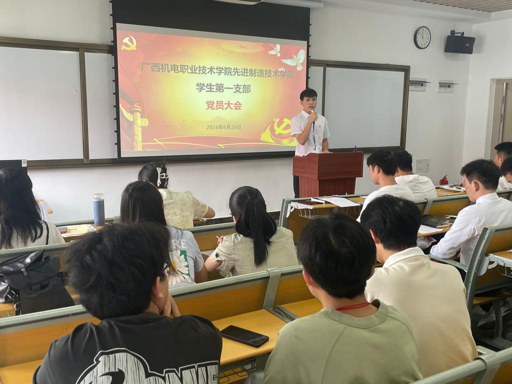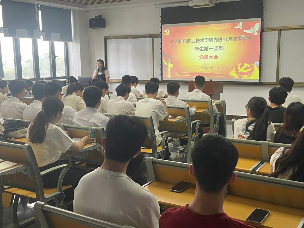 6月28日,先进制造技术学院学生第一党支部在笃行楼501教室召开全体党员大会,讨论接收预备党员转正,大会由党支部书记黄姣姣主持,支部全体党员、入党积极分子参加了会议。