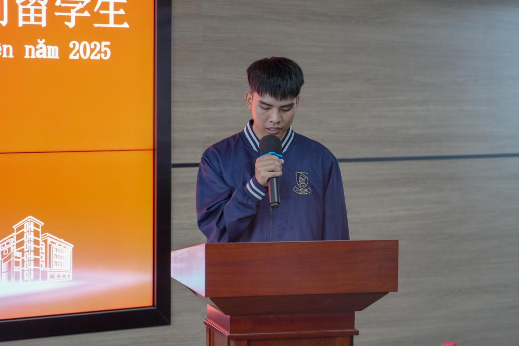 越南学生代表阮嘉武用中文发言,表达了对在中国学习的期待和努力学习的决心。他表示将尽快适应新环境,认真学习专业知识和中国文化,成为促进中越青年友谊的桥梁。
