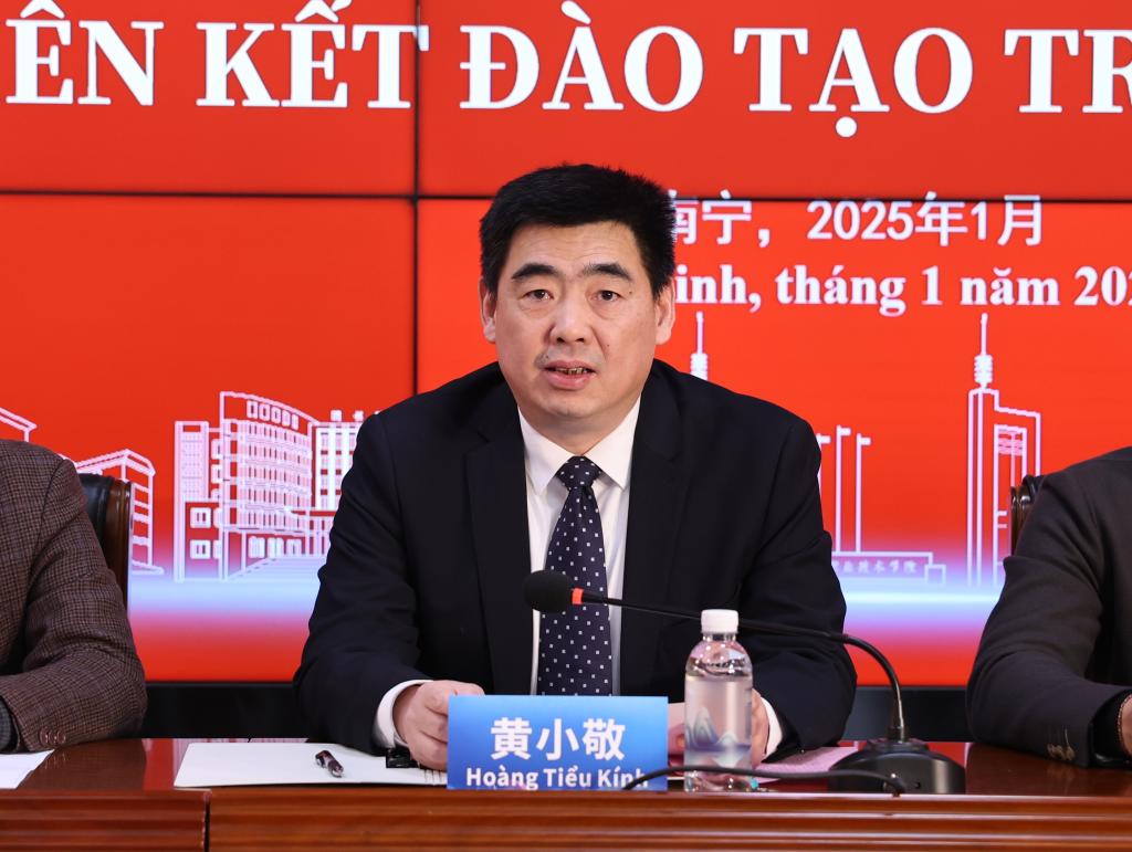 黄小敬在致辞中,向圆满完成课程学习的同学们致以热烈祝贺,向合作院校和企业以及辛勤付出的老师们表示衷心感谢和诚挚谢意。他指出,在中越建交75周年、中越人文交流年这样一个特殊年份,举办中—越联合培养学生结业典礼具有格外特别的意义。不仅是万象城官网从地方高校层面深入贯彻落实好中越两党两国领导人达成的重要共识,深化与越南伙伴院校友好合作,促进人文交流,助力构建具有战略意义的中越命运共同体的重要成果,也是落实《中越联合声明》、响应习近平总书记“中越友好的根基在人民、未来在青年”嘱托,把中越世代友好的接力棒接过来、传下去,推动中越友谊之树不断开花结果的生动实践。他希望越南同学回国后努力做中越友谊的传承者,做企业发展的助力者,做终身学习的奋斗者,用自己的智慧和汗水,为中越两国发展繁荣和人类进步事业作出更大贡献。