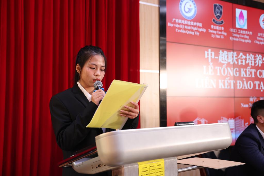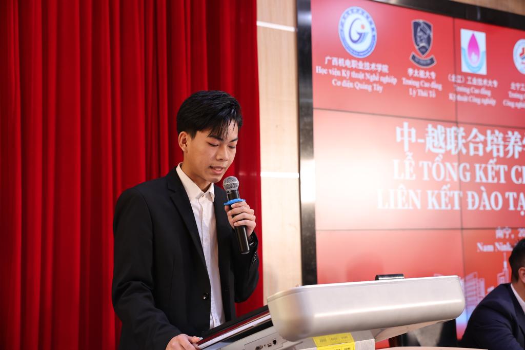 越南学生代表严春成和陈氏垂玲分别发言,他们表示在机电学院度过了难忘的学习时光,感激老师如同亲兄弟姐妹般的悉心关怀,帮助他们顺利跨越了初入校门时的语言难关和文化交流的鸿沟,感谢学校为他们创造了在先进教学设施中愉悦学习的机会,使他们得以亲身接触并了解中国的前沿科技与新技术,感谢拥有一流技术的老师的辛勤教导,让他们在技术技能上得到了快速提升。