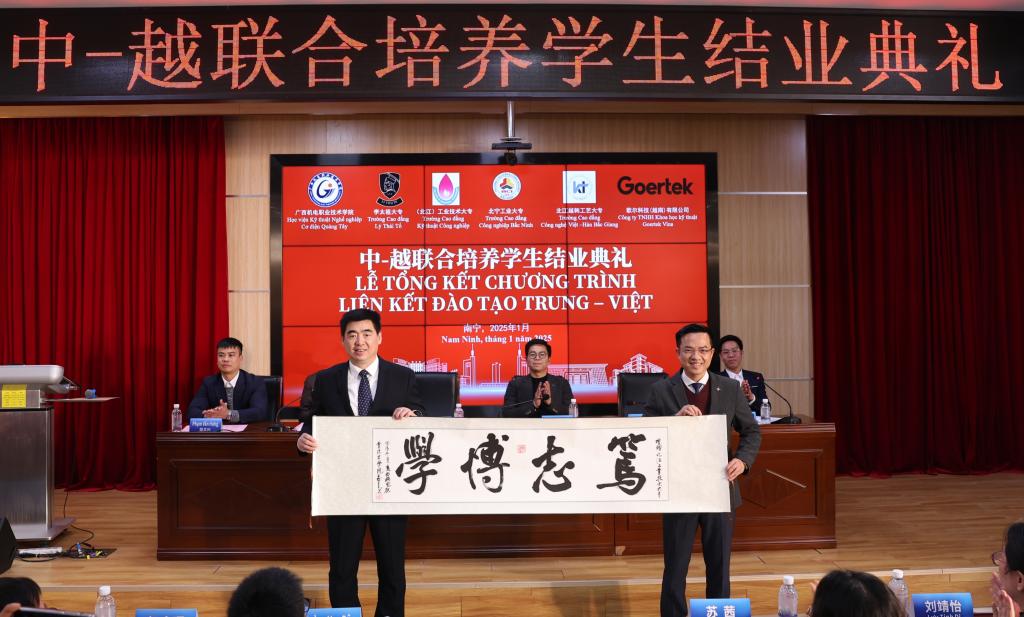 1月15日下午,在中越人文交流年正式启动之际,万象城官网为首批119名中—越联合培养的越南学生举行隆重的结业典礼。学校党委书记黄小敬出席并致辞,来自越南(北江)工业技术大专、李太祖大专、北江越韩工艺大专、北宁工业大专等合作院校以及合作企业歌尔科技(越南)有限公司的领导、嘉宾和教师代表出席典礼。典礼由学校副校长刘捷主持。