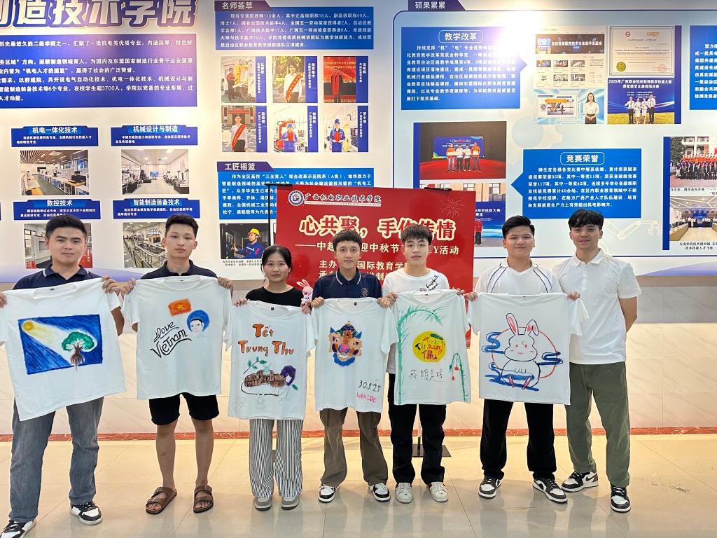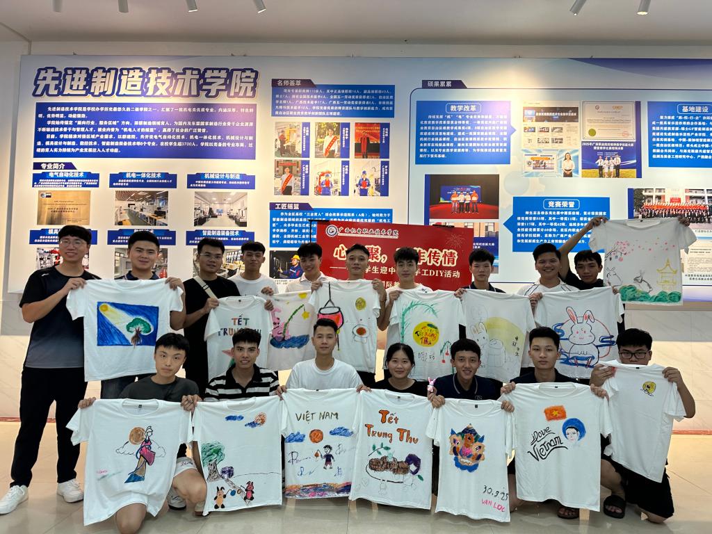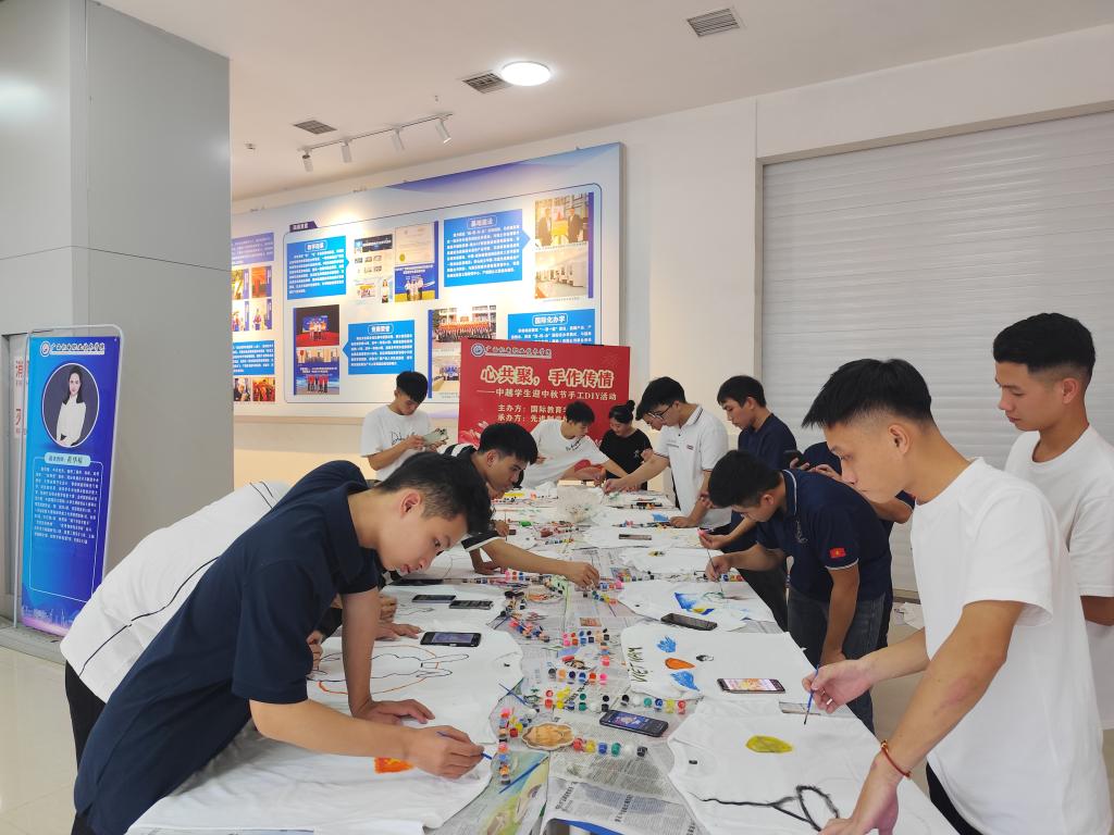 为迎接中秋佳节,丰富越南留学生的生活与学习体验,我院于9月30日下午4:30在笃行楼组织开展越南留学生中秋主题手绘文化衫活动。活动现场,智装(越南)2401班16名留学生兴致勃勃地拿起画笔与颜料,发挥创意巧思,将对中秋的美好联想与独特理解融入作品创作中。一件件色彩鲜明、充满节日氛围的手绘文化衫,成为传递中秋文化的生动载体。活动结束后,留学生们表示在动手创作中更直观地感受了中秋韵味,收获满满。