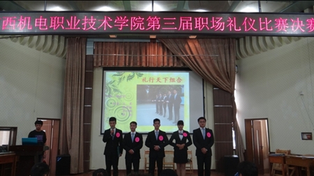 本届大赛共分为三个环节:团队介绍PPT展示、模拟面试情景剧、礼仪知识问答。我系代表队第二个登场,伴随着优美的轻音乐,队长张友才用标准流利的普通话分别介绍团队成员,完整流畅优美的完成了礼仪礼姿展示。在职场招聘情景剧中,我系代表队采用幽默风趣新颖独特的模拟面试情景展演赢得在场观众阵阵热烈的掌声。其中我系队员王星在剧中饰演的是有后台的面试者,绘声绘色,入木三分,更是让在场观众看得津津有味。礼仪知识问答环节,我系代表队张友才和韦乃锋互相配合,体现了我系学生之间的团结互助,不断进取的精神风貌,他们的回答获得了评委老师的一致好评。
