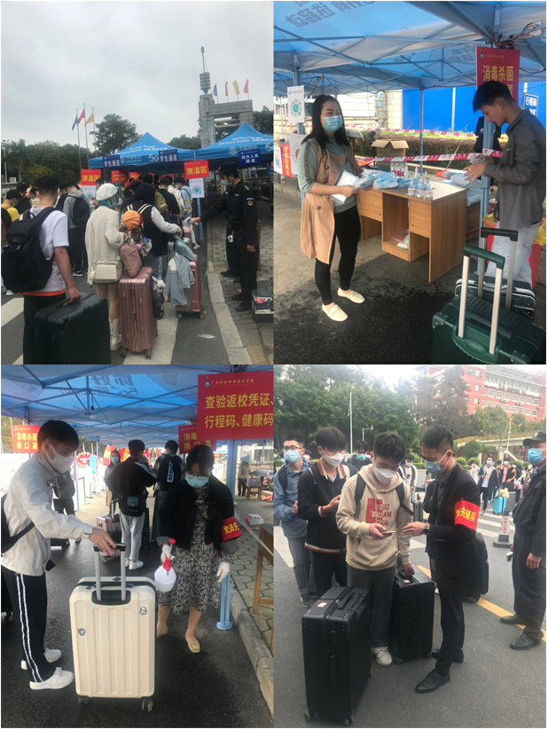 入校核验点,学生在教师党员先锋队工作人员引导下,按照事先安排好的流程有序报到,分别进行体温测量、返校凭证、健康码和通信大数据行程卡等报到手续。学院教师党员先锋队在西、北两校门认真核验学生入校手续,为学生行李消毒、提醒学生更换口罩。以热心、暖心的态度,细心、用心的行动迎接学生们返校,第一时间为有需要的学生提供帮助,得到了家长、学生们的一致好评。