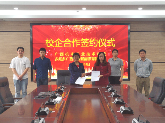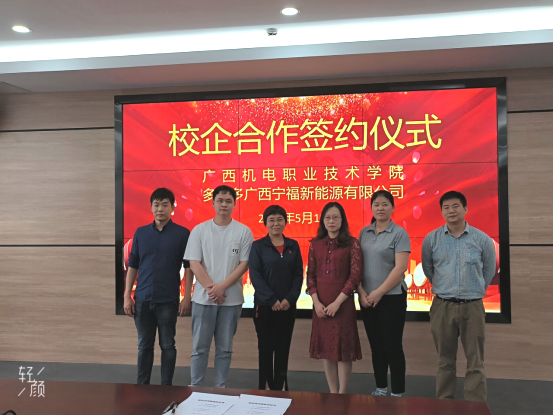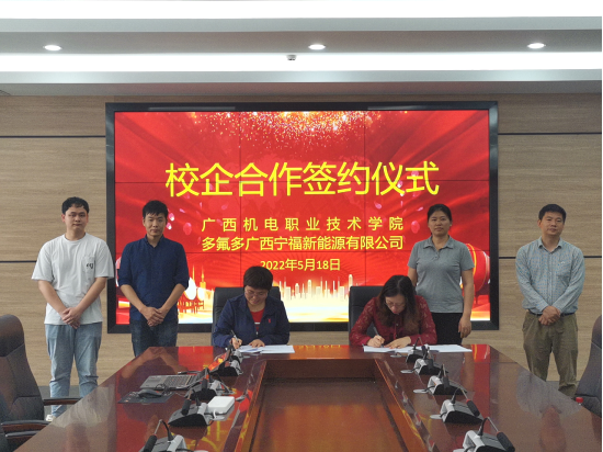 2022年5月19日,机械工程学院与多氟多-广西宁福新能源科技有限公司签订校企合作框架协议。机械工程学院苏茜教授、电气工程学院喻宁娜副院长、多氟多——广西宁福新能源科技有限公司人力资源部部长张云洁女士、人力资源部招聘经理刘小坡等相关人员参加签约仪式。双方对学生实习、毕业生就业、教师企业锻炼、企业人才招聘、企业项目攻关等事项进行合作。5月10日,多氟多-广西宁福新能源公司总经理助理吴林、南宁市青秀区驻宁福公司工业特派员甘瑜一行到校进行了企业介绍及首轮洽谈。