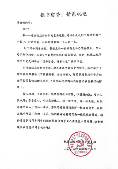 活动前期,学生党支部发起“捐书留香,情系机电”的倡议书,同学们积极响应号召,将用过的、读过的书捐给图书馆。有的同学捐出一系列期刊,有的同学捐出心爱的名著,有的同学捐出大学课本,活动在全院师生的大力支持下圆满结束。