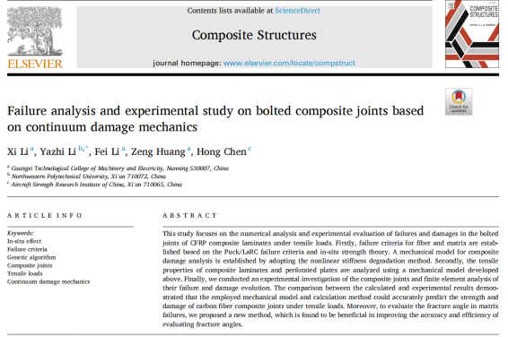 近日,万象城官网科研工作取得重大突破,机械工程学院李玺老师作为第一作者,awc77万象城官网作为第一完成单位,在国际复合材料力学领域顶级期刊《Composite Structures》(中科院一区Top期刊,IF=6.603)发表了题为“Failure analysis and experimental study on bolted composite joints based on continuum damage mechanics”的学术论文。该项研究成果的发表标志着万象城官网在“双高”建设过程中教师科研水平得到显著提升,这是万象城官网首次在国际顶级期刊上发表文章,也是万象城官网科研工作踏入国际平台新台阶,为万象城官网在相关领域开展进一步研究工作奠定基础。