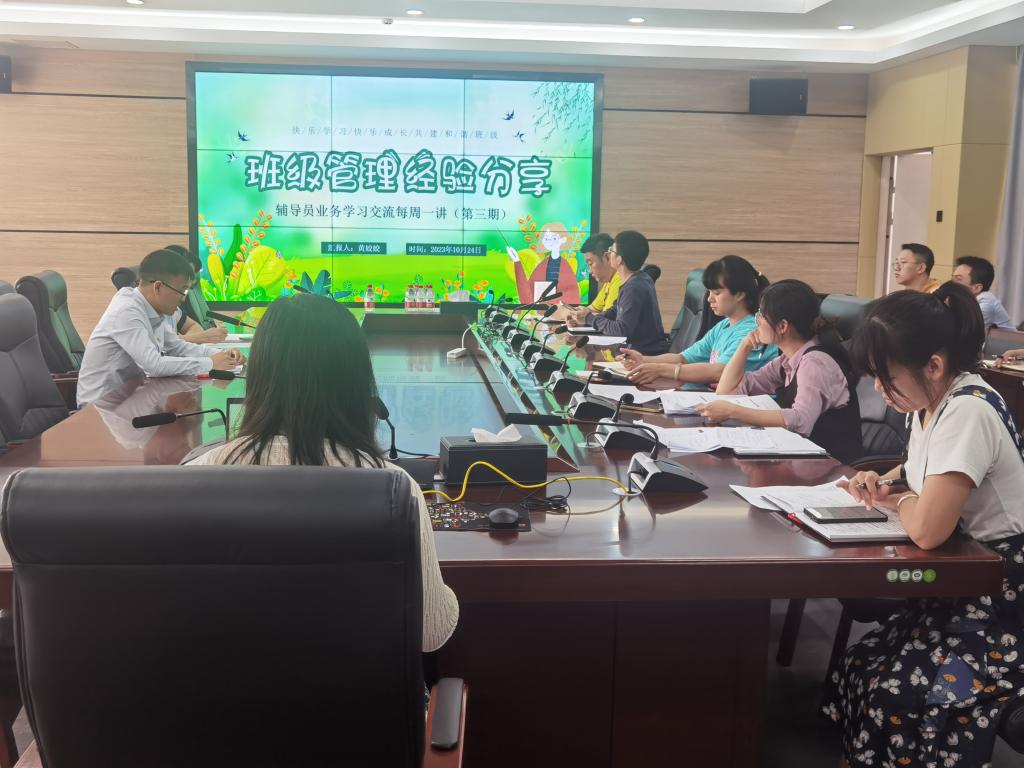 围绕“党员和班级建设、学风建设、日常事务管理、心理健康教育与咨询”等辅导员主要工作职责,黄老师开展了《班级管理经验分享》的业务交流学习活动。首先,她从会议记录的填写、评选过程的公开公正、材料的存档方法等多方面详细分享了开展“奖助贷勤补免”学生资助体系工作的经验。其次,她分享以宿舍为单位收集心理周报表、每月发放心理问卷、及时开展谈心谈话等心理健康教育方法,有利于我院辅导员更好地开展心理健康教育工作。随后,她从值周班干负责考勤、严抓各项纪律、及时处理问题等方面进行了日常事务管理经验的分享与交流。最后,她重点分享了提高班级凝聚力,创建优良班风的特色活动——“每周一次小活动,每月一次大活动”。特色活动的开展不仅可以提高学生的综合素质,而且也可以培养学生的集体荣誉感,提高班级的凝聚力。