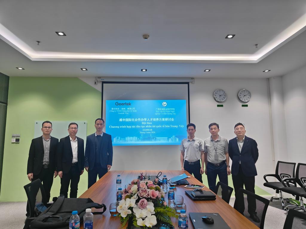 在歌尔科技(越南)有限公司,代表团参观了工业园区、研发基地、生产车间等场所,与中方技术员座谈交流,了解员工岗位职责、工作内容及用人需求。随后参观了歌尔匠造培训中心(匠造工学院),了解培训中心的教学模式和岗前培训内容。最后,结合越南学校的人才培养情况和公司对技能人才的需求,确定了人才培养方案及教学进程表。