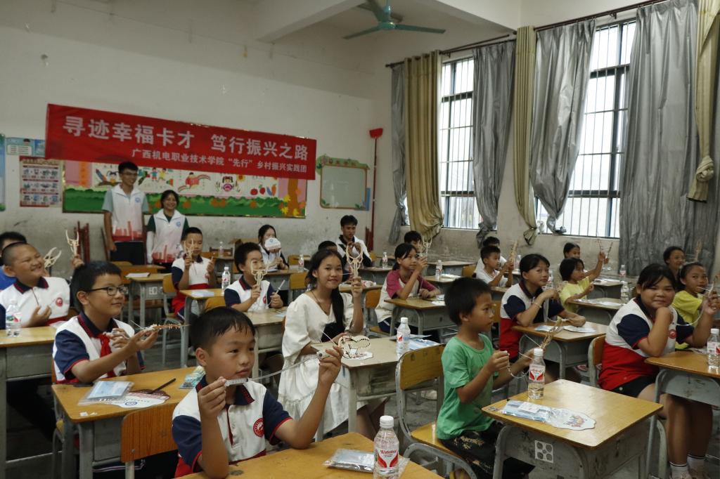 “同学们,你们的梦想是什么?”教室里小学生们都踊跃举起小手,清澈明亮的眼眸闪着星光。这是一群生活在巴马大山里的孩子,蜿蜒逶迤的山路限制了他们享有更充分的教育资源和机会,很多孩子的求学之路止步于大学之前,不曾想过更远的未来,对“职业梦想”这个词也感到遥远而陌生。7月22日,实践团来到中国工农红军巴马瑶族自治县西山红军小学,为这里的孩子们带来了一堂别开生面的职业启蒙教育课——“谁是卡才小小梦想家”。实践团通过宣讲职业启蒙知识、制作手工机械臂模型、绘制“职业梦想”团扇等活动,与这里的孩子们一起点亮梦想,畅想未来。