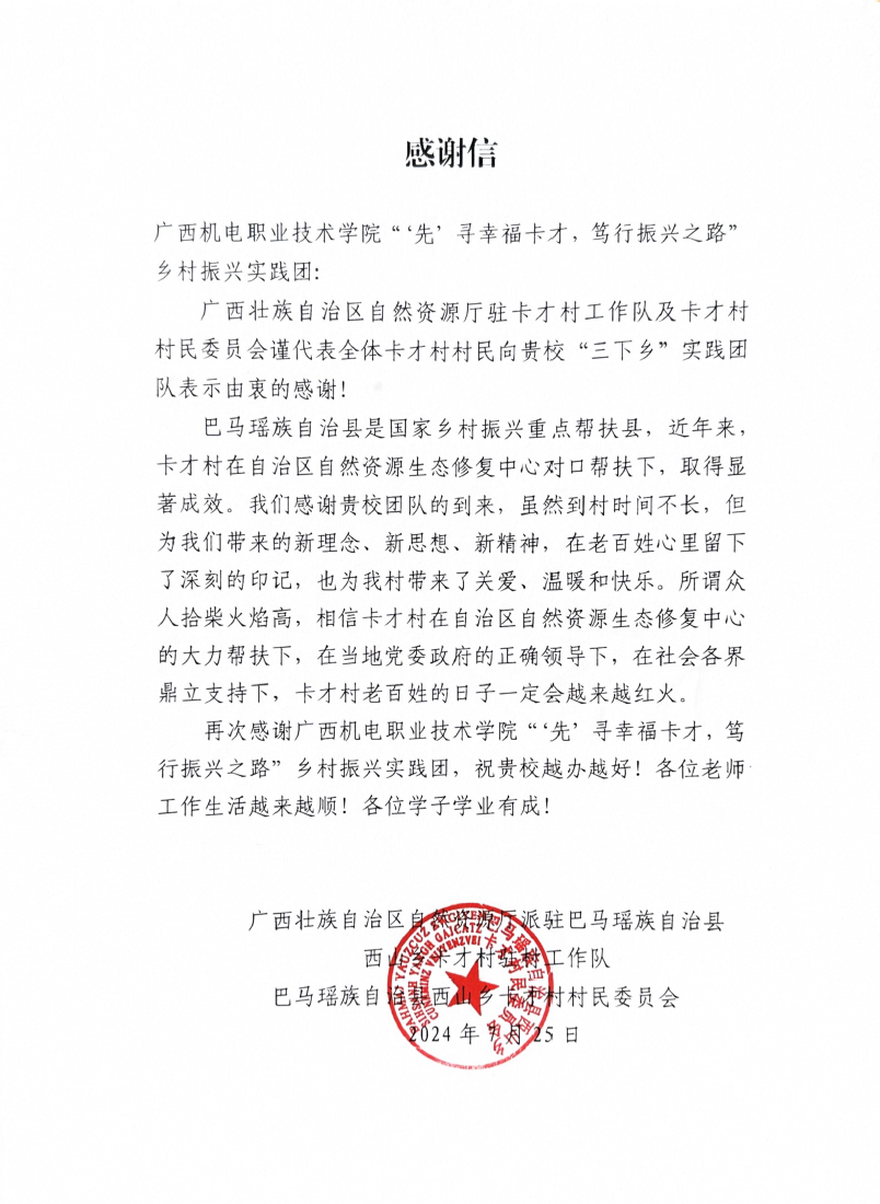 为深入学习贯彻党的二十届三中全会精神,及时将学习成果转化为实践动力,7月18日,awc77万象城官网“‘先’寻幸福卡才,笃行振兴之路”乡村振兴实践团,怀揣着建设和美乡村的梦想,踏上了前往广西河池巴马瑶族自治县西山乡卡才村开展社会实践活动的征程。此次“三下乡”活动,以打造宜居宜业、和谐美丽的乡村为愿景,探寻卡才村和美之源,践行务实笃行的精神,为乡村振兴事业贡献青春力量。