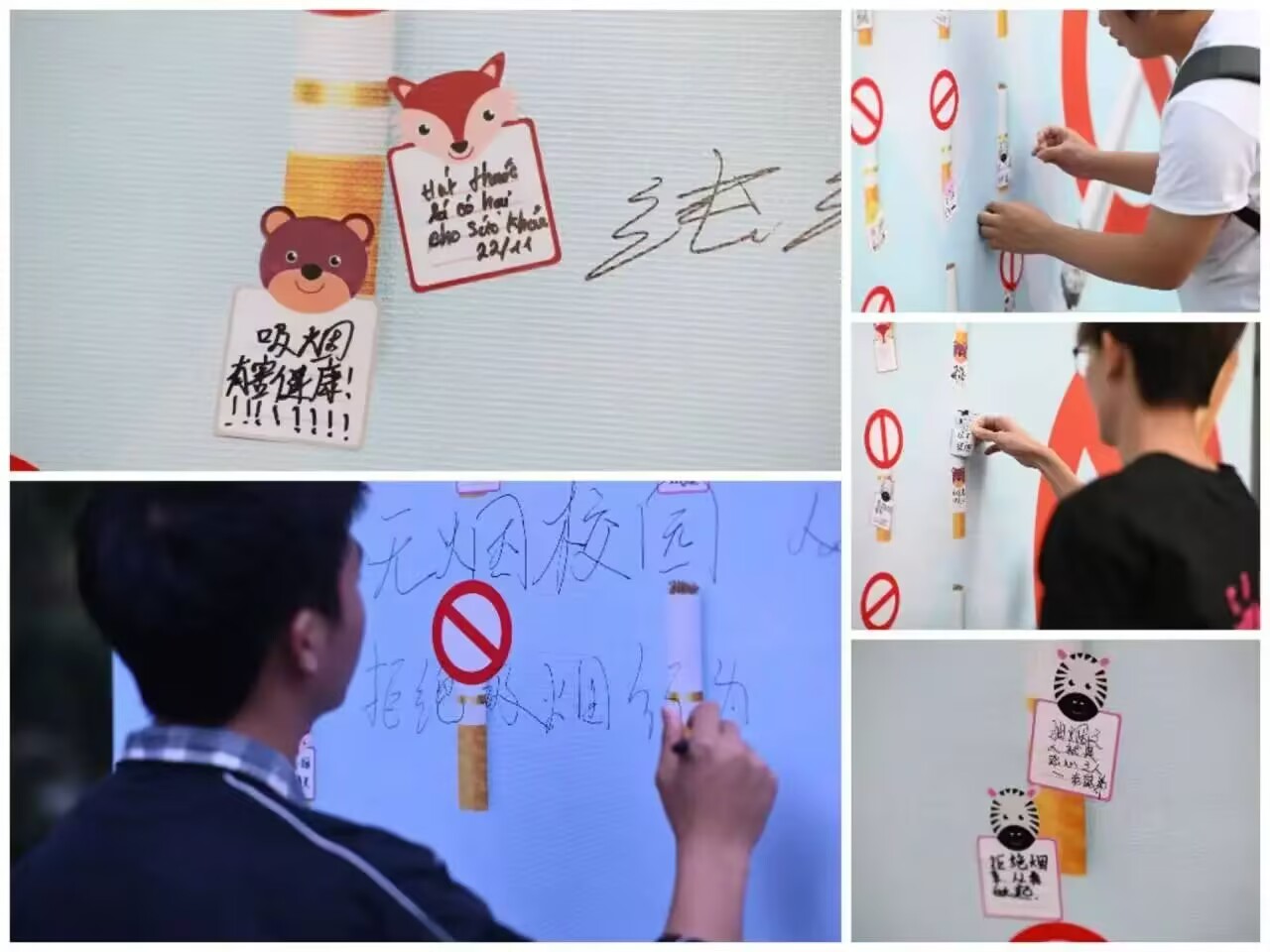 同学们在现场手写无烟倡议,为燃烧的香烟贴上“禁止”符