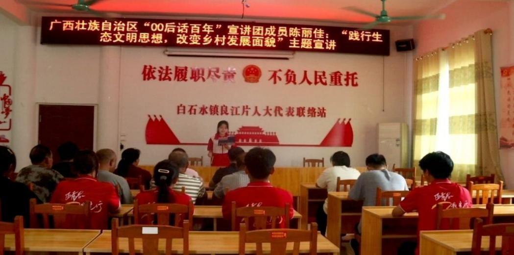 实践团成员陈丽佳,是自治区“00后”话百年宣讲团成员,她对于习近平生态文明思想有着自己的认识理解。在良江村村委会议室里,陈丽佳面向村委、村民开展了一场主题为“践行生态文明思想,改变乡村发展面貌”的宣讲。宣讲中解读了习近平生态文明思想的核心内涵,强调了绿色发展理念在当今社会的重要意义,并结合良江村得天独厚的生态优势,向村民们深入浅出地讲述了绿色发展理念的实践路径,引发了村民们的普遍共鸣。“小姑娘说得蛮对,我们这里就是注重生态才会有现在的样子。”一位村民阿姨这样说道。