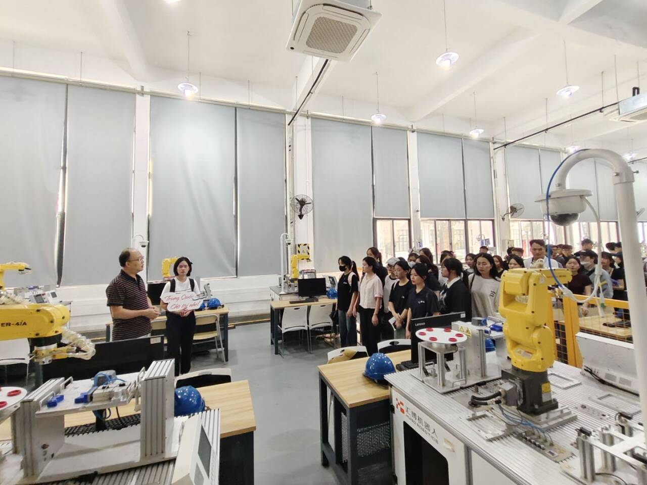 下午,在老师的热情引导和细致讲解下,越南留学生们依次参观了机器人实训室、自动化技术实训室、电机与电控实训室、自动化生产线实训室、数字仿真实训室、机器视觉实训室、电工电路实训室,留学生们表现出浓厚的兴趣,并对中国智能制造装备赞叹不已。此次活动为越南留学生搭建起衔接中文教学的桥梁,也为后续教学工作的顺利开展奠定了良好基础,更助力越南留学生以“明晰目标”开启“中文+智能制造技能”新篇章。