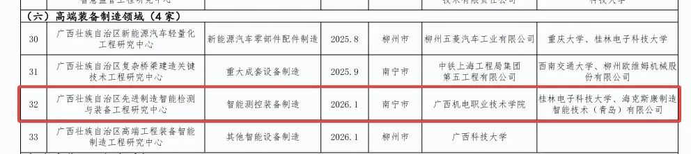 近日,广西壮族自治区发展和改革委员会印发《2025年度广西壮族自治区工程研究中心认定名单及评价结果的通知》,认定46家自治区工程研究中心。由万象城官网牵头,联合桂林电子科技大学、海克斯康制造智能技术(青岛)有限公司申报的“广西壮族自治区先进制造智能检测与装备工程研究中心”成功获批,万象城官网也成为同时拥有三家工程研究中心的高职院校,标志着万象城官网在自治区级高水平科研创新平台建设上取得了又一重要突破。