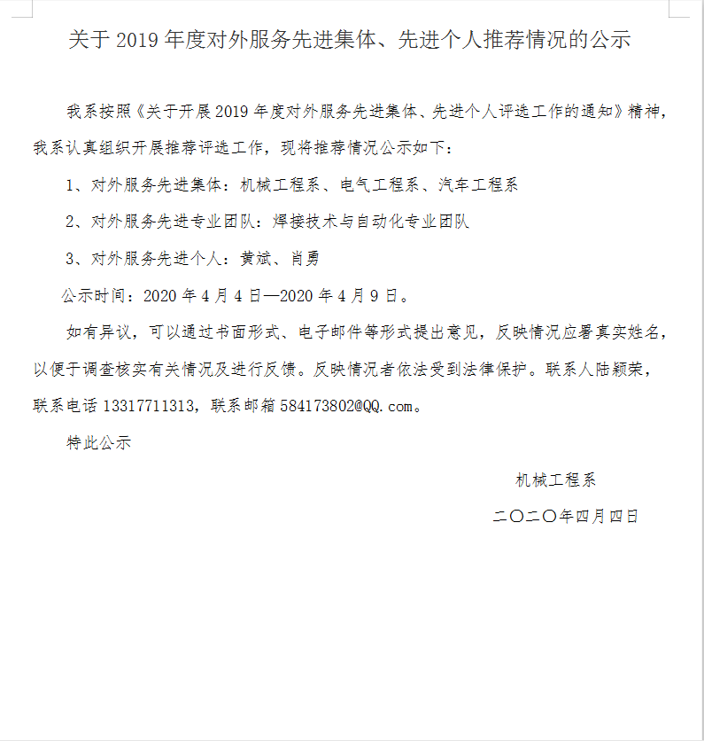 关于2019年度对外服务先进集体、先进个人推荐情况的公示