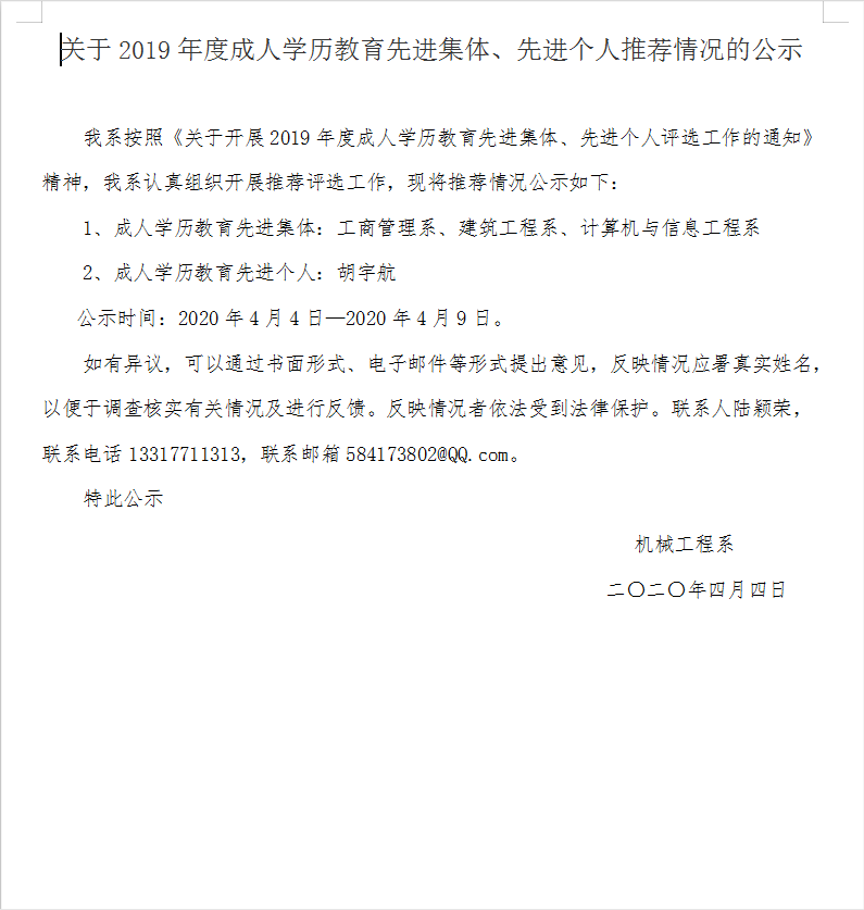 关于2019年度成人学历教育先进集体、先进个人推荐情况的公示