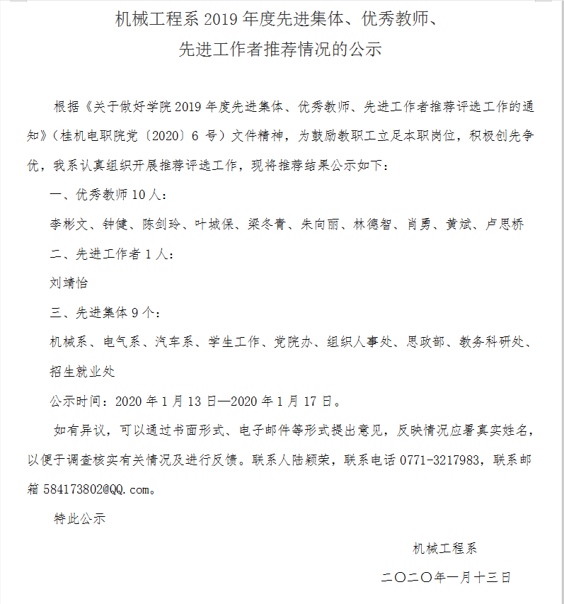 机械工程系2019年度先进集体、优秀教师、先进工作者推荐情况的公示