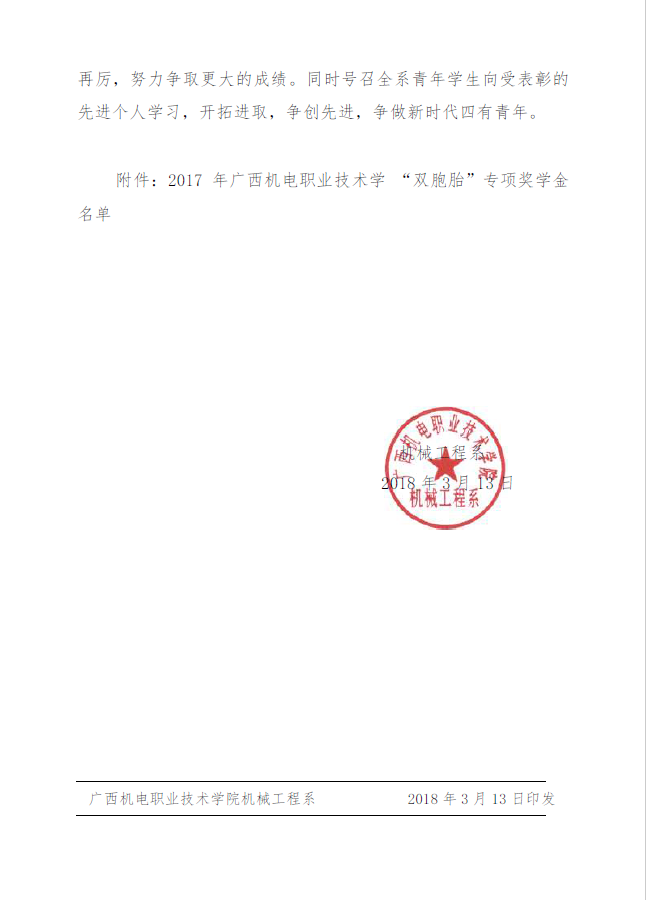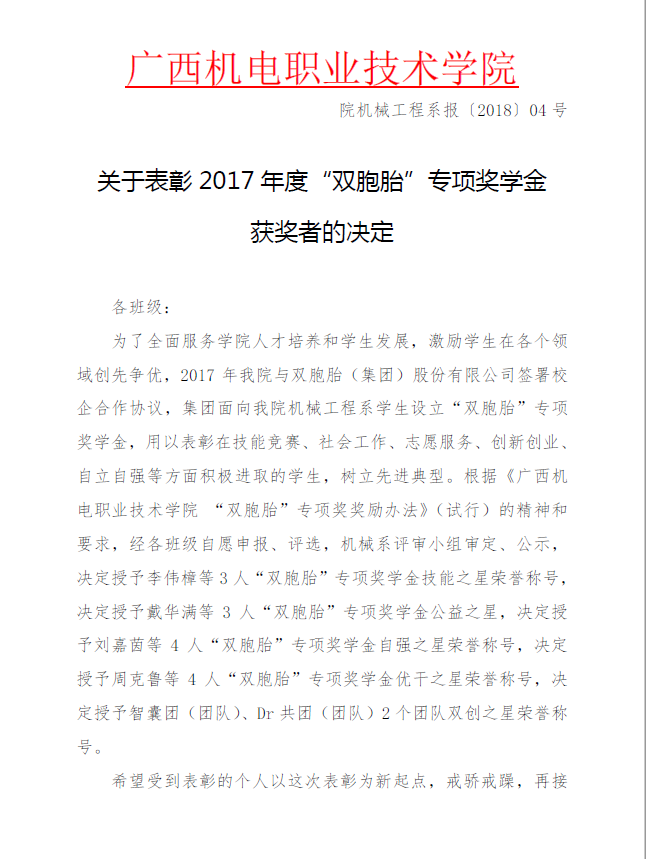 关于表彰2017年度“双胞胎”专项奖学金 获奖者的决定