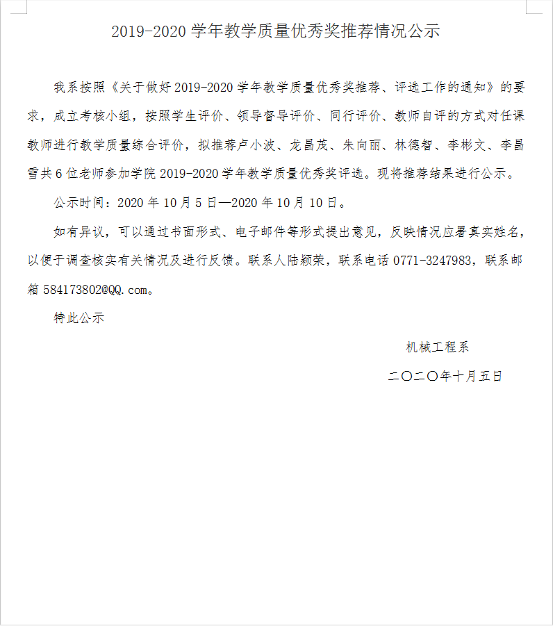 机械工程系2019-2020学年教学质量优秀奖推荐情况公示