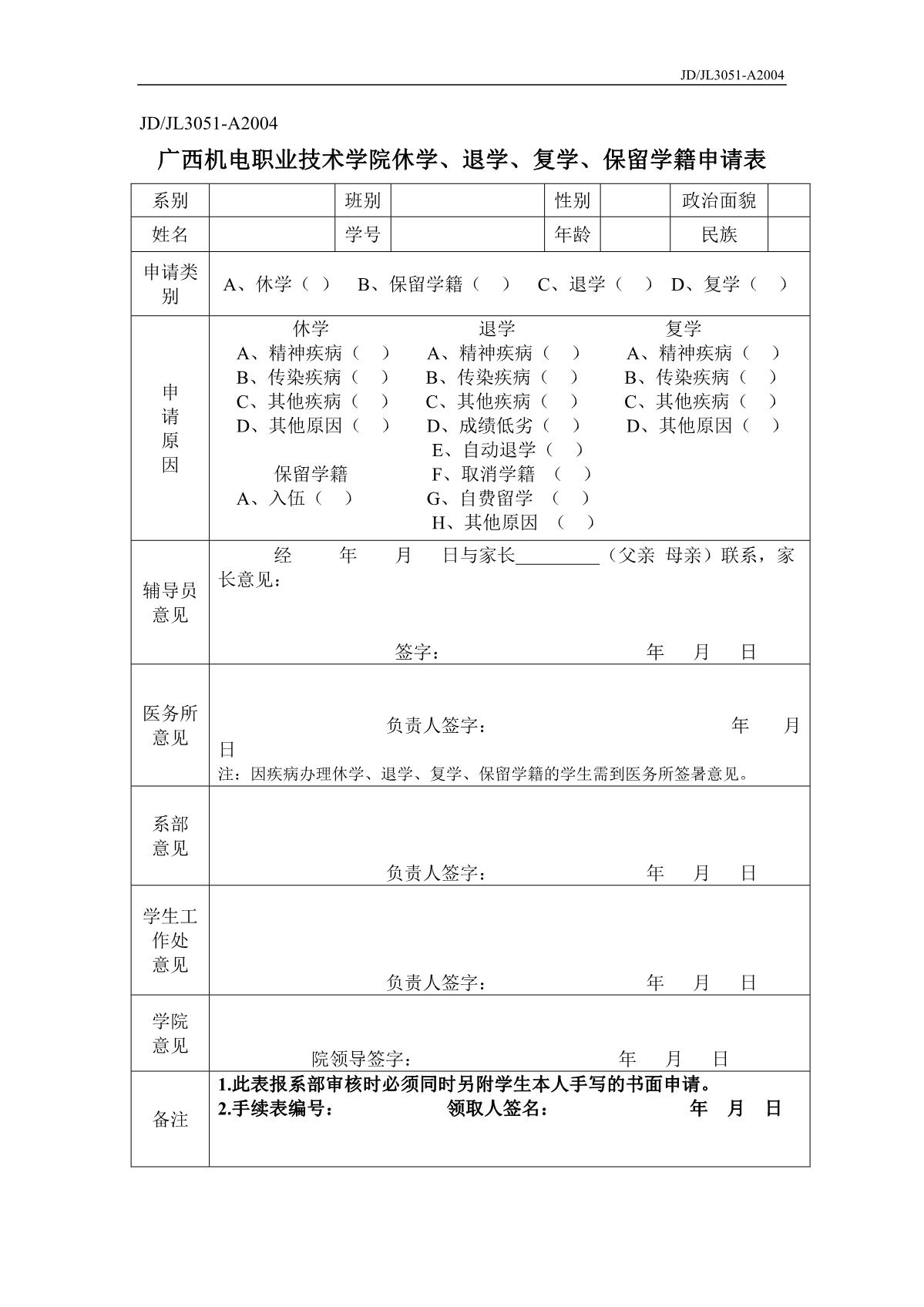 awc77万象城官网休学、退学、复学、保留学籍申请表