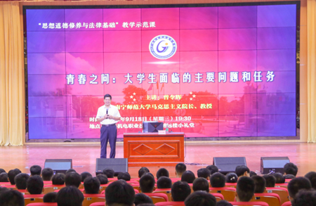 此讲主题教育课邀请到南宁师范大学马克思主义学院院长、广西高校思政课教学指导委员会首席专家、广西教师名师、博士生导师曾令辉教授主讲。曾教授深入浅出地分析了当代大学生所面临的主要困惑以及时代青年肩负的重要使命,激发学生主动思考问题,积极寻找答案,引导同学们坚定“四个自信”的意识,帮助新生树立新时代背景下将个人的青春梦融入中国梦的理想信念,使初入大学校园的同学们有所思、有所想、有所悟、有所获。曾教授的讲课既有严密的逻辑性又具有很强的感染力,现场网络平台的应用增强了互动性,同学们纷纷表示这是一堂内容生动而内涵丰富的入学教育课。