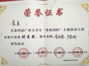 10月31日,由自治区党委宣传部(自治区国防教育办公室)、广西军区政治工作局、自治区教育厅共同主办的第四届广西大学生“爱我国防”主题演讲大赛在广西艺术学院举行,由我系李佳男老师、卢思桥老师指导的机制1901班的黄真同学代表学院首次参加比赛,最终荣获优秀奖的好成绩。
