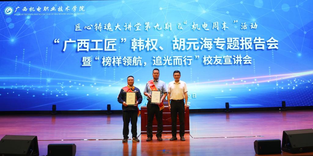 校友宣讲会上,校长吴世先为“广西工匠”韩权、胡元海颁发“优秀校友”荣誉证书