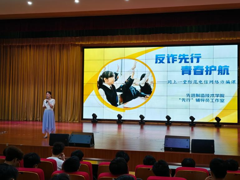 为深入贯彻落实高校安全教育工作要求,切实增强新生交通安全和防范电信网络诈骗意识,9月19日上午,先进制造技术学院、“先行”辅导员工作室组织2025级新生在学校小礼堂开展了入学安全教育。南宁交警八大队警官李斐振、学院党委副书记刘靖怡分别围绕交通安全、反诈防诈两个主题为在场学生讲授了安全第一课。