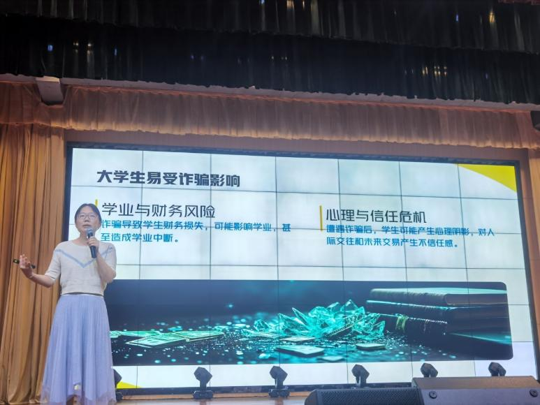 防范电信网络诈骗的教育环节,刘靖怡书记提到,大学是人生中最明媚的阶段,但电诈陷阱却会让青春蒙上阴霾。她着重分析了大学生作为诈骗犯罪分子重点“围猎”对象,身陷诈骗案所带来严重影响。为此,她提出“技防”先行、“人防”筑基、“术防”升级、“社防”聚力的“四步护航”法,号召全体新生共同构建“安全守护共同体”。在反诈教育环节尾声,刘靖怡对新生寄语“守护青春,平安校园,防范电诈,你我先行”,铿锵的十六字,既是对全体新生的青春守护令,更是共建“无诈校园”的动员令。