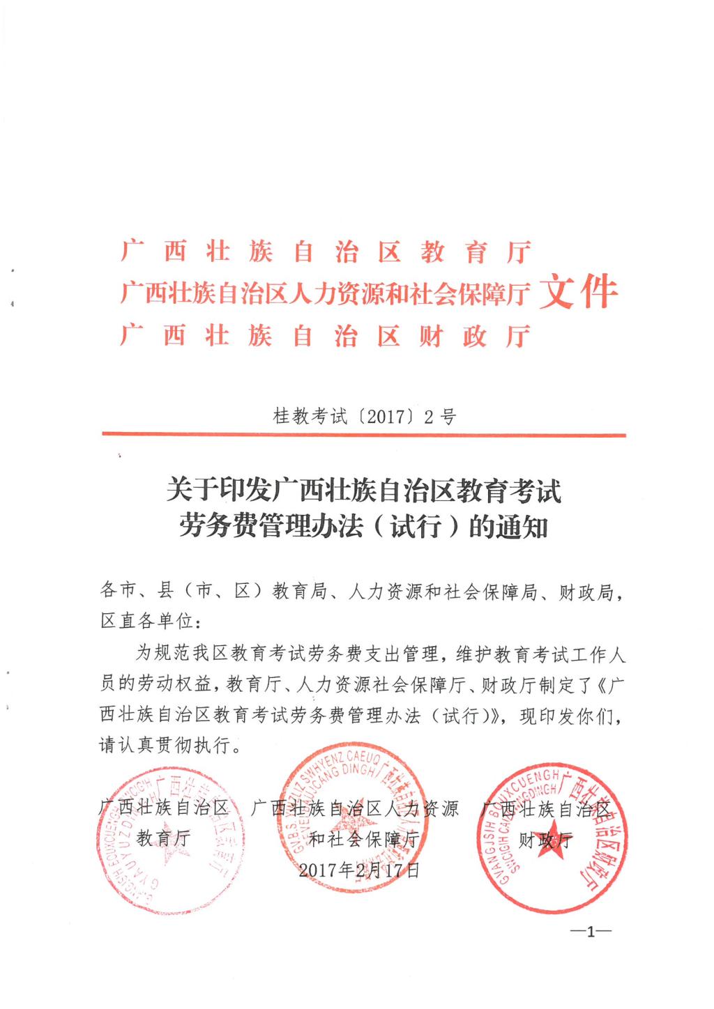 关于广西壮族自治区教育考试劳务费管理办法(试行)的通知