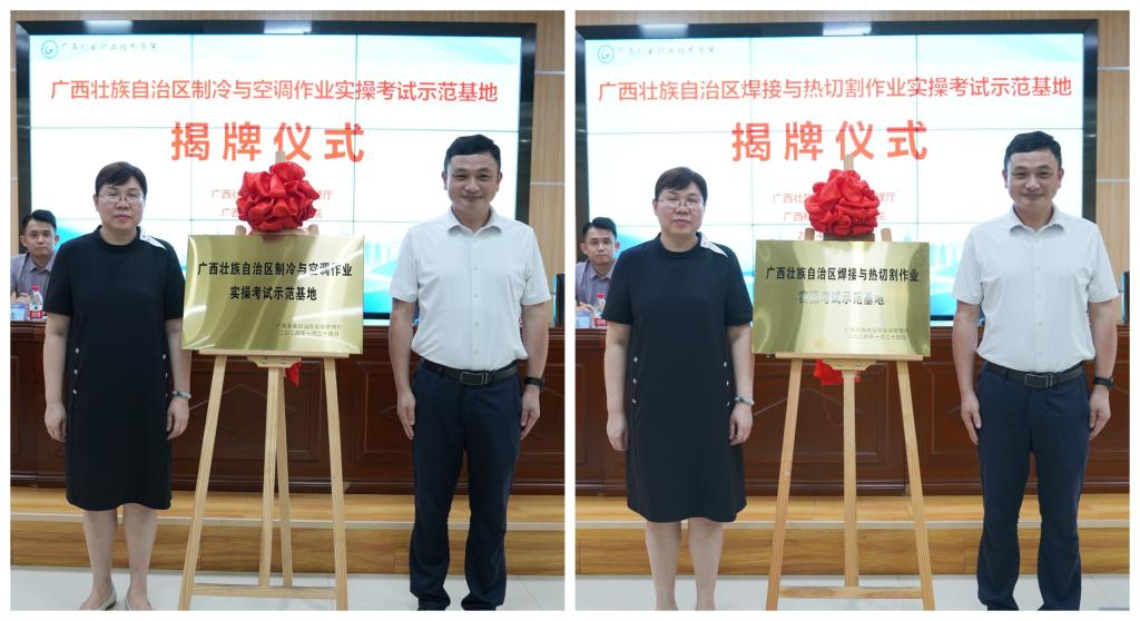 容芳主任、吴世先校长共同为自治区焊接与热切割作业实操考试示范基地、自治区制冷与空调作业实操考试示范基地揭牌。