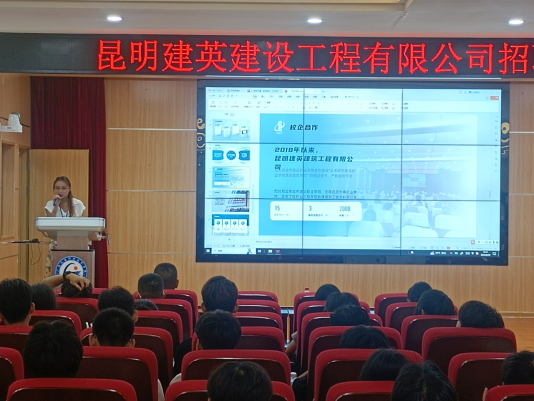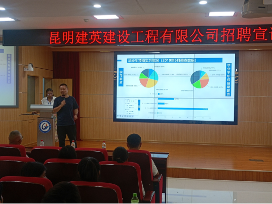 昆明建英建筑工程有限公司是一家以现场施工工艺资料编制、收集、整理归档一体化的公司,项目类别有光伏、电力、房屋建筑工程、市政公用工程、城市轨道、公路建设等。会上罗满书记与昆明建英建筑工程有限公司胡陈经理进行了深入交流,全面了解了实习学生招聘数量需求、实习生项目食宿条件、实习生实习期间工资待遇,会后企业负责人逐一解答了同学们关于工作地点、工作时间、劳动强度、未来发展等等关心的问题。