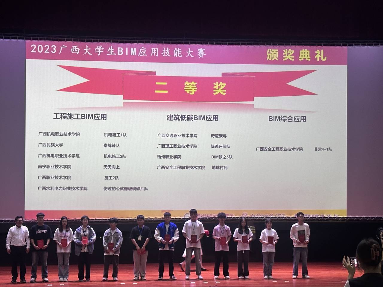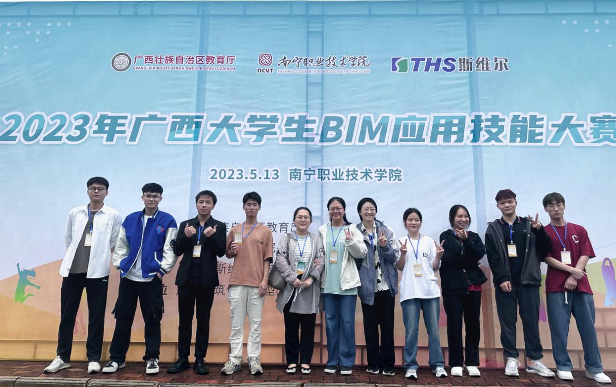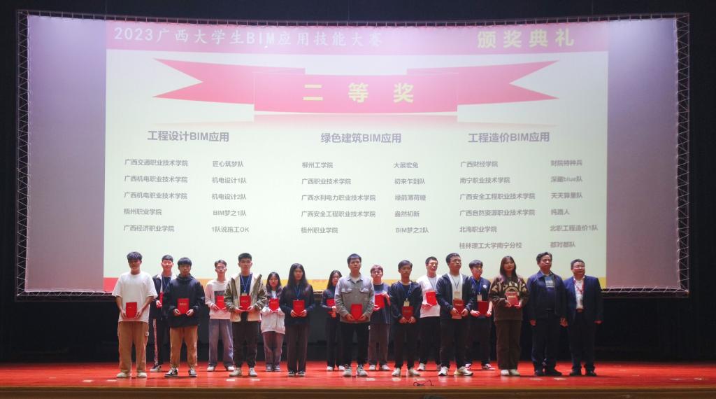 5月13日,由广西壮族自治区教育厅主办的“2023年广西大学生BIM应用技能大赛”在南宁职业技术学院如期举办,本届比赛共有来自41所高校的194支团队,近千名学生现场竞技。经过与全区高校选派各代表队激烈角逐,由我院选手李晶雯、王柳青、李鸣杰、钟瑞亮、莫镇涛、袁国龙、岑丽州、庞思清、白文芳、韦德高所组成的2支代表队最终分别排第6名和第8名,均荣获工程施工BIM应用赛项二等奖;由陈冠宇、罗晓庆、陈世煜、吴华仲、梁材、韦仁坚、陈露桦、陆思磊、张鸿润、周鸿润所组成的2支代表队最终分别排第5名和第6名,荣获工程设计BIM应用赛项二等奖。
