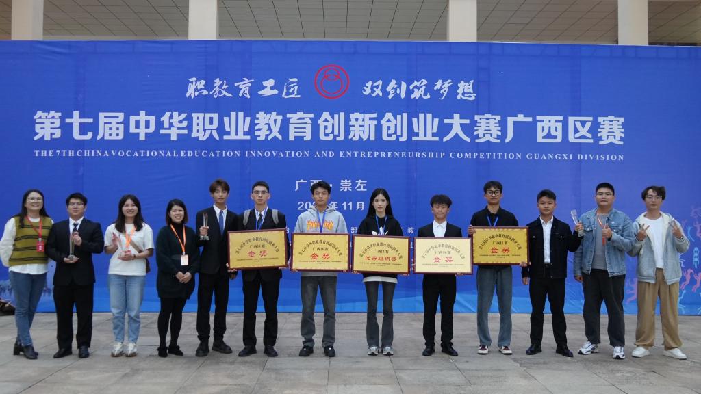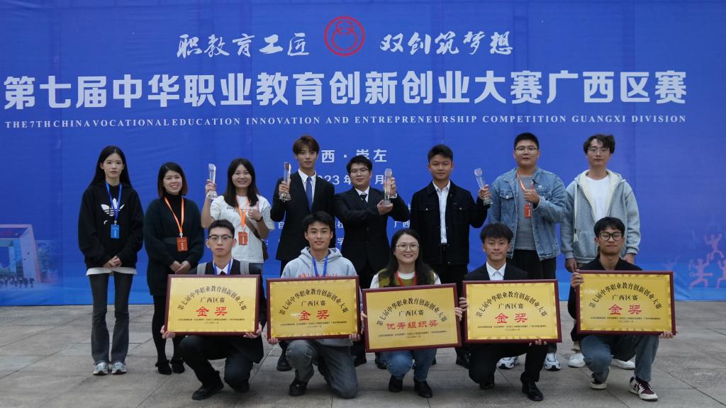 11月22日至23日,第七届中华职业教育创新创业大赛广西区赛决赛在广西城市职业大学(空港校区)举办,来自广西高等院校及中等职业学校的100个项目团队进行激烈比拼。经过校内决赛、区赛网评,我院共有2支队伍突出重围,进入区赛现场决赛环节,经过两天的激烈角逐,我院参赛项目庚禧建筑——首创“力对冲”砼3D打印农村公厕方案提供者、脑情检测--基于脑电波信号的穿戴式情绪检测设备等2个项目获得高职组金奖。