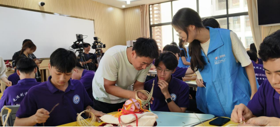 活动第二阶段,我院师生与留学生们一起开展手工芒编活动。首先,工作室负责人卜庭梅老师向留学生们介绍了广西博白特产——芒编,它是广西古老的指尖上的艺术,可以制作各种篮筐、花瓶、背包等,既有实用价值,又有观赏价值。在观看芒编小船的制作视频后,留学生们在工作室老师和学生的指导和帮助下,都完成了自己的芒编作品。他们都纷纷表示特别开心能有这个机会学习中国传统民族技艺,了解中国传统文化。