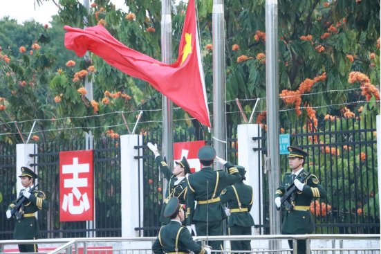 上午7时,升旗仪式正式开始。国旗护卫队队员迈着铿锵有力的步伐护送国旗入场,全体师生肃立注目,高唱国歌,注视五星红旗冉冉升起。