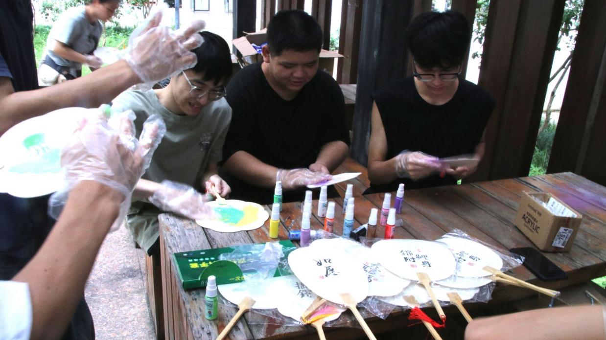 活动现场,参与者在工作人员指导下,利用落叶、环保颜料和喷笔等材料,亲手制作植物喷画扇。从叶片的选材与摆放,到色彩的搭配与喷涂,每一步都融合了自然元素与艺术灵感。“原来一片普通的落叶也能成为独特的画布!”一位参与学生展示着自己的作品,扇面上斑驳的叶脉纹理与绚丽的色彩交织,展现了植物与美学的巧妙融合。