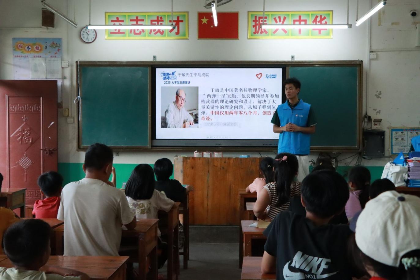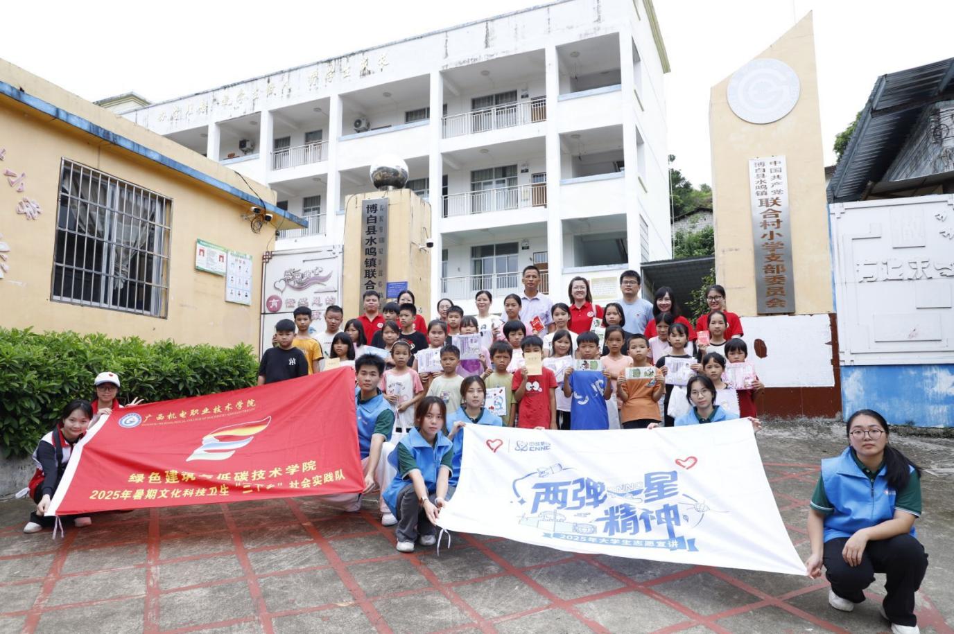 为弘扬传承“两弹一星”精神,厚植青少年家国情怀,激发科技报国之志,2025年7月23日,awc77万象城官网绿色建筑与低碳技术学院“红砖青年”宣讲团走进博白县联合村小学,开展“两弹一星”精神主题宣讲活动,吸引了30余位学生参与。此次活动通过生动宣讲、互动问答、拼图体验和文创手绘等形式,将红色基因融入乡村教育,为联合村孩子带来一堂别开生面的“大思政课”。