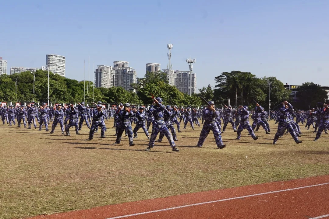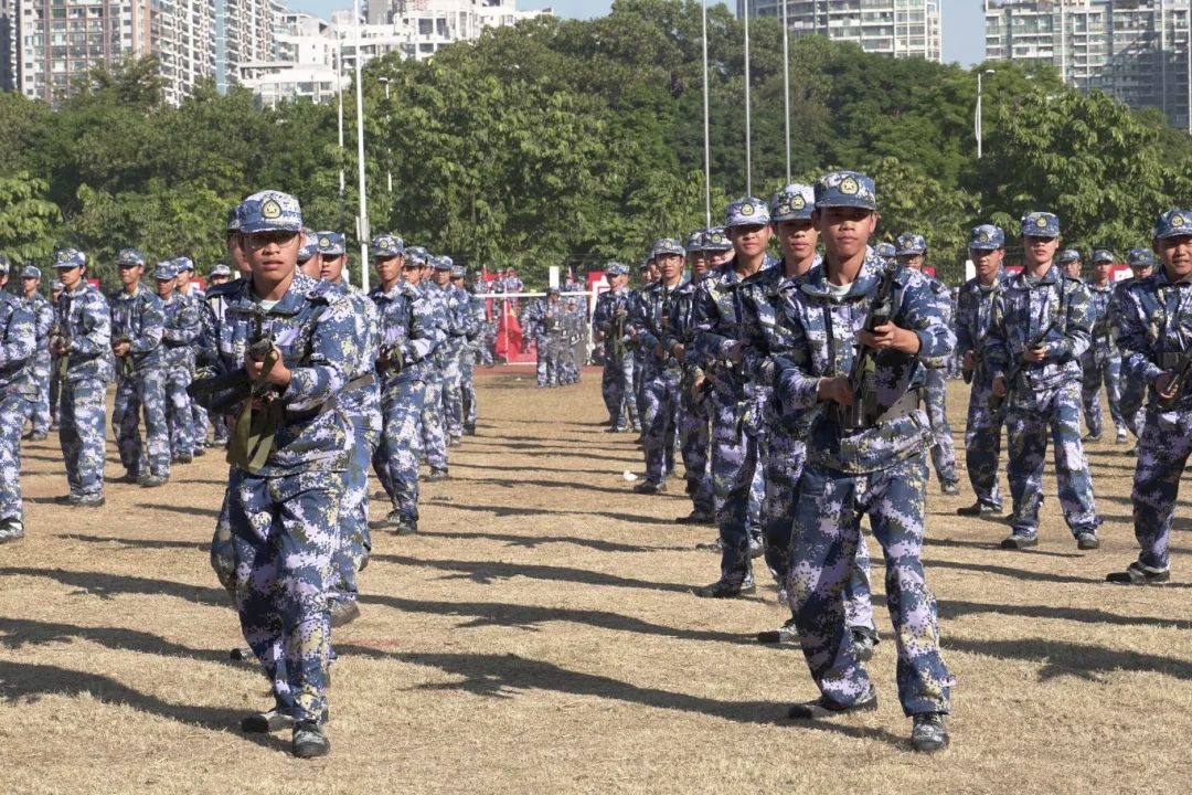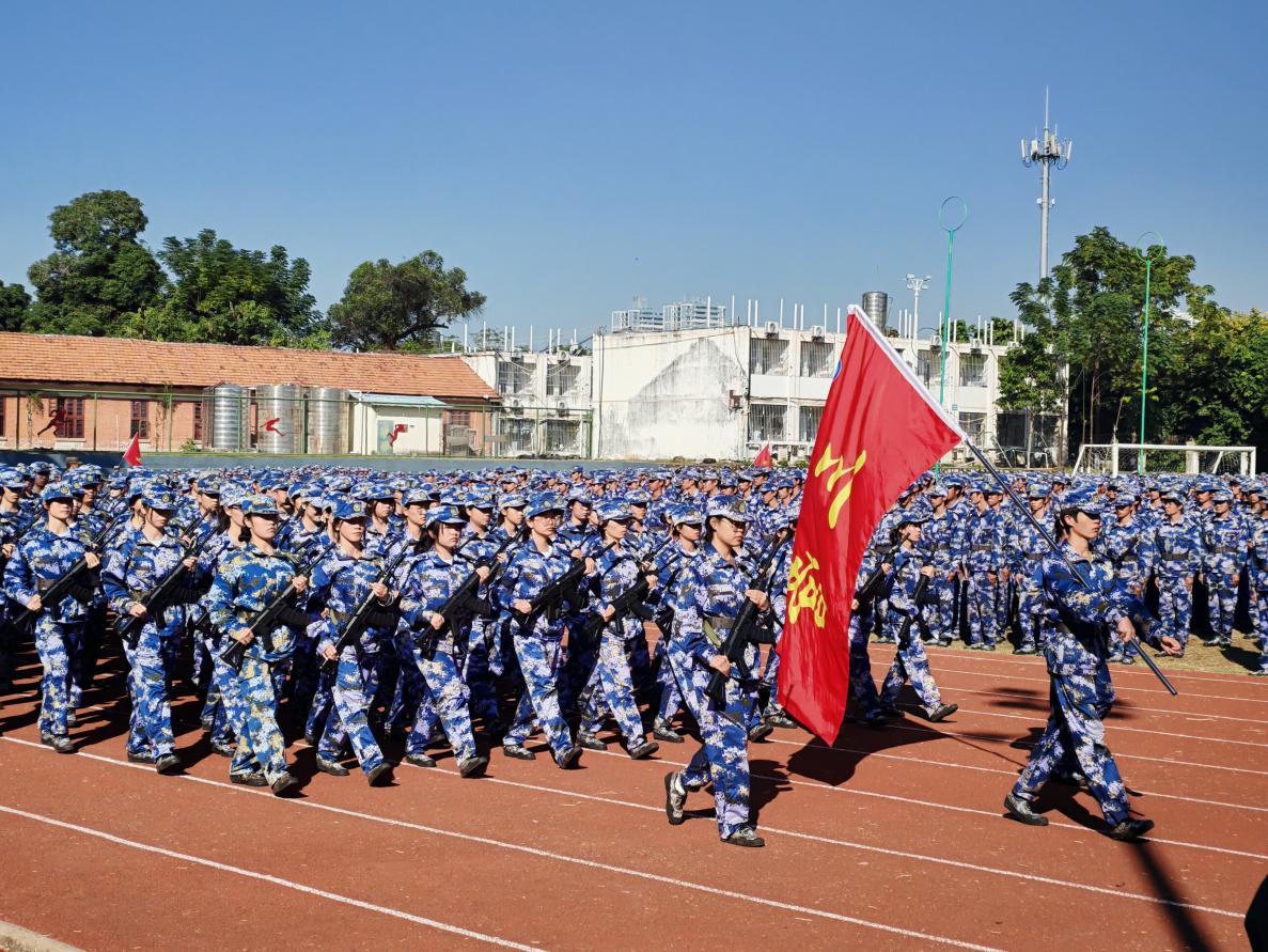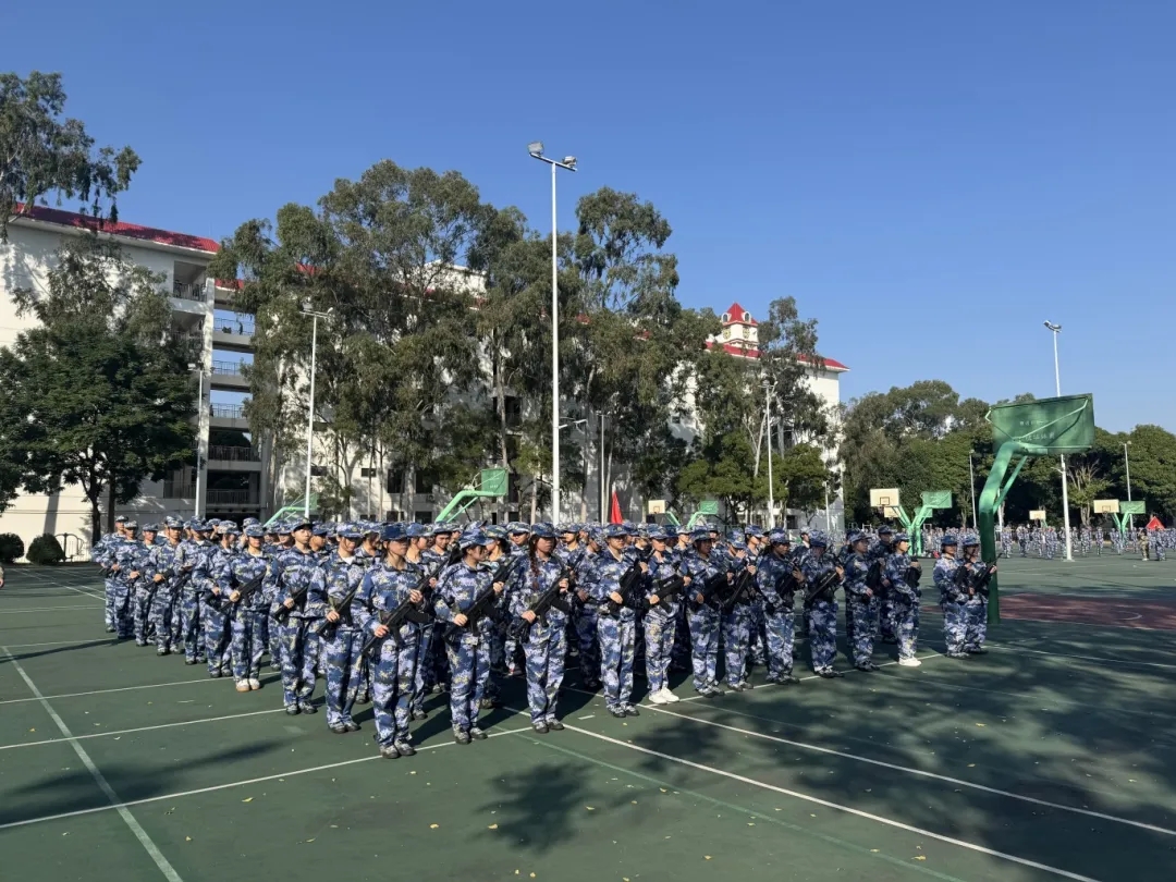 军事训练成果展示开始,分列式方队昂首阔步,以铿锵有力的口号依次走过主席台接受检阅。他们步伐坚定,身姿挺拔,目光坚毅,整齐的队伍展现着青春活力与拼搏精神。