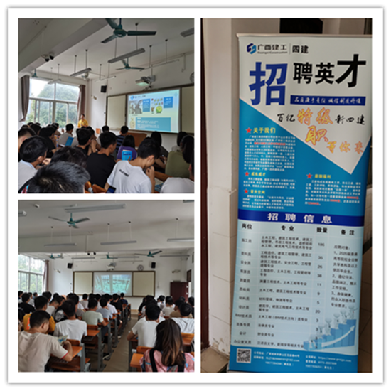 10月22日下午,广西建工集团第四建筑工程有限责任公司(以下简称“四建”)团委书记黄文韬及公司组织人事处副处长黄新涛等一行五人到我院开展公司招聘宣讲。我系工程造价、建筑工程技术、工业设备安装工程技术等专业的应届毕业生共计70余人参加了宣讲会,招聘宣讲会在1203教室进行。