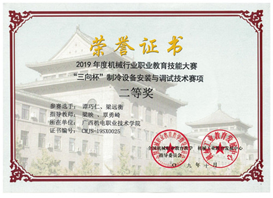 近日,2019年全国机械行业职业教育技能大赛——“三向杯”制冷设备安装与调试技能大赛在山东商业职业技术学院落下帷幕。由我系空调1701班谭巧仁、梁远衡两位同学组成的参赛队伍,在梁映、覃勇崎两位老师的精心指导下,以扎实的专业功底和精湛的专业技术,夺得了大赛“二等奖”。