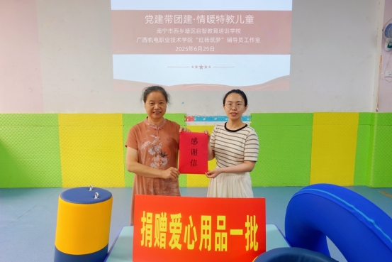 “七一”前夕,绿色建筑与低碳技术学院学生党支部与“红砖筑梦”辅导员工作室联合主办的“党建带团建,情暖特教儿童”主题党日活动,在南宁市西乡塘区启智教育培训学校举行。学院师生党员、入党积极分子、共青团员组成的20余名志愿者,通过义务支教、空调清洗等志愿服务,深化落实“三全育人”理念,发挥专业特色,展现出机电青年青春风采。
