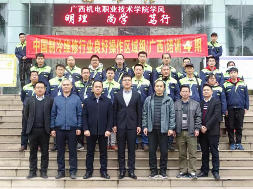 黄政艳副院长在致辞对中国制冷维修行业良好操作区域级(广西)培训中心职业学校师资班开班表示热烈祝贺,对中国制冷学会、广西制冷学会、桂物金岸制冷空调技术有限公司、南宁市快朗冷气设备有限公司等行业企业一直以来对我院制冷空调专业人才培养给予的大力支持表示衷心的感谢!黄副院长介绍中国制冷维修行业良好操作培训项目是联合国环境规划署《蒙特利尔议定书》多边基金支持项目,具体由生态环境部对外合作与交流中中心负责实施,中国制冷维修行业良好操作区域级(广西)培训中心2019年12月24日正式揭牌,由中国制冷学会和我院联合主办。同时介绍了学院“十四五”发展规划描绘的新蓝图提出的“再造一个新机电”,实现三个“翻一番”战略目标和“123720”发展思路,加快学院发展,积极推动校企合作、深化产教融合,奋进机电扬帆再起航!对各位学员和企业朋友来校培训几点简单要求:一是遵守培训安排、纪律要求,认真参加培训;二是爱护培训设备设施,积极参加训练;三是加强交流、增进友谊、促进合作;四是宣传节能环保理念,实践推广中国制冷维修行业良好操作。