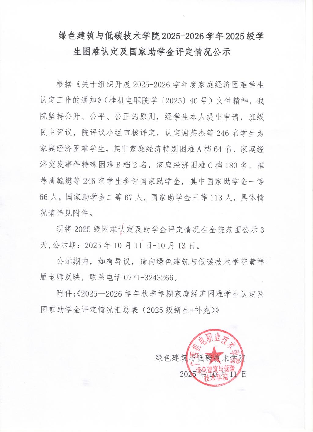 绿色建筑与低碳技术学院2025-2026学年2025级学生困难认定及国家助学金评定情况公示
