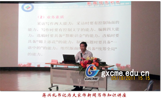 2011年5月17日下午,广西民族大学文学院党委书记蒋兴礼为我院建筑工程系师生作新闻写作知识讲座。建筑工程系全体老师、系团总支学生会学生干部及各班级通讯员近200名师生到场听取了讲座。讲座由建筑工程系副主任潘杰老师主持。