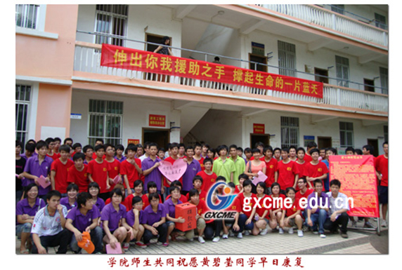 “一方有难,八方支援”。当得知黄碧莹同学的情况后,我系团总支、学生会向我系全体师生发出了关于“伸出你我援助之手,撑起生命的一片蓝天”爱心捐款倡议书并得到了全体师生的积极响应。