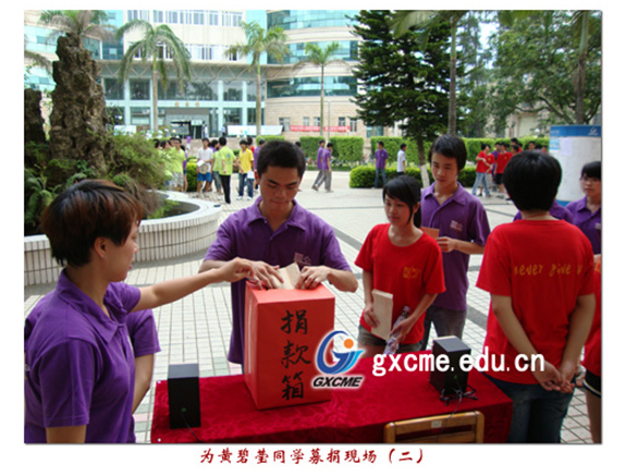 2011年6月21日15时30分,我系师生在系办公楼前简单的举行了“向黄碧莹同学献爱心”的募捐仪式。我系教师和各班级学生代表将募集到的捐款投进捐款箱中,路过捐款现场的许多学生和老师也纷纷慷慨解囊,伸出援助的双手。学院青年志愿者协会现场捐款1000元。当日下午共收集到捐款10047.7元。